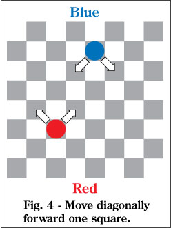 A player can move one of his checkers, or a mixed color 2-stack with his own color showing (at the top of the stack), one square diagonally forward. See Figure 4.
