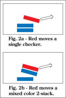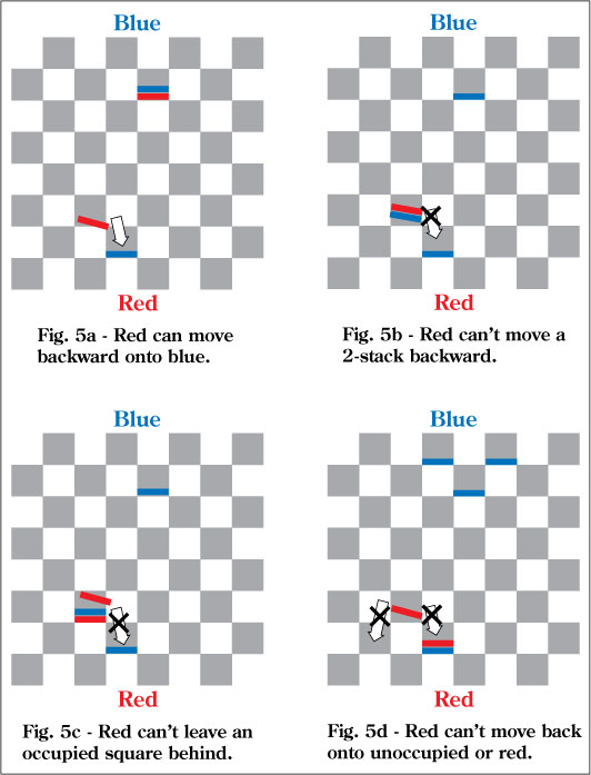 onto a showing blue checker. You can't move a 2-stack backward. See Figure 5b. You can't move backward leaving an occupied square behind. See Figure 5c.