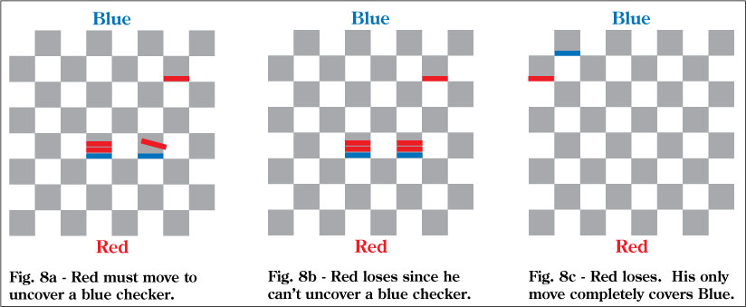 In Figure 8a, Red must move to uncover a blue checker. Red loses the game in Figure 8b because, since he can only make one move during his turn, he is unable to uncover a blue checker. It's Red's turn to move in Figure 8c. Red loses since he must move and his only available move covers Blue's only showing checker.